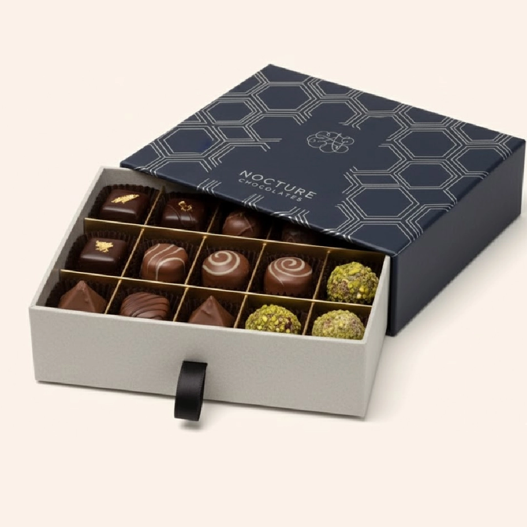 - High-end chocolate box design with luxury finishing options.